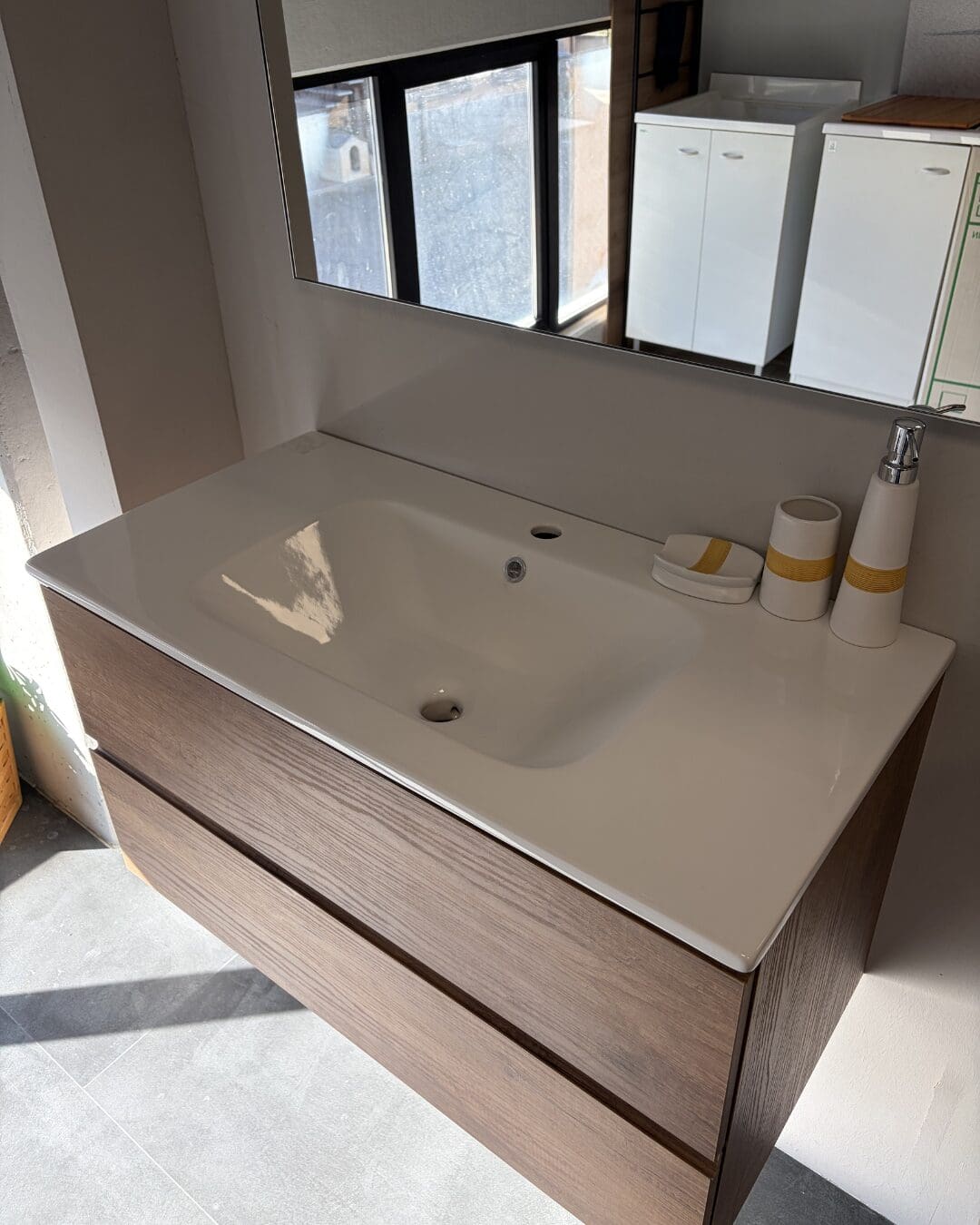 Caratteristiche tecniche: Scocca e Frontali in truciolare Melaminico idrorepellente, Top ceramica OPUS bianco lucido, Vasca centrale, Cassetto carenato bianco di serie, Guide metalliche ad estrazione totale c/sponde in metallo e sistema di chiusura “soft close” integrato.
