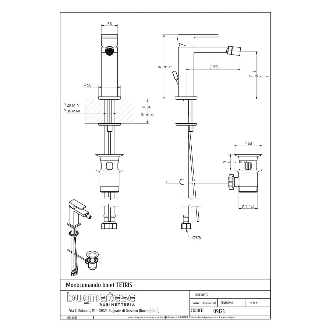 Caratteristiche tecniche: Miscelatore monocomando da bidet con scarico automatico 1″1/4 con flex inox, con cartuccia da 25 mm.