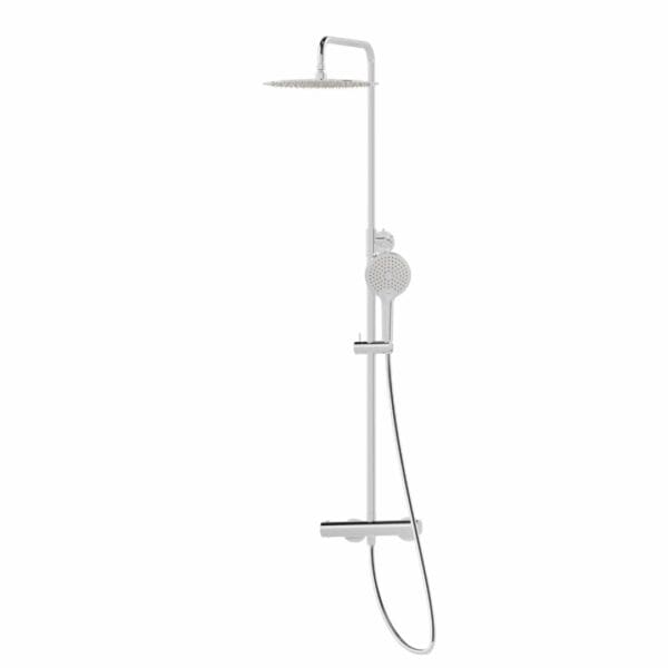Caratteristiche tecniche: Colonna doccia telescopica, con miscelatore termostatico esterno completo di deviatore, soffione in acciaio e doccetta 3 getti in ABS.