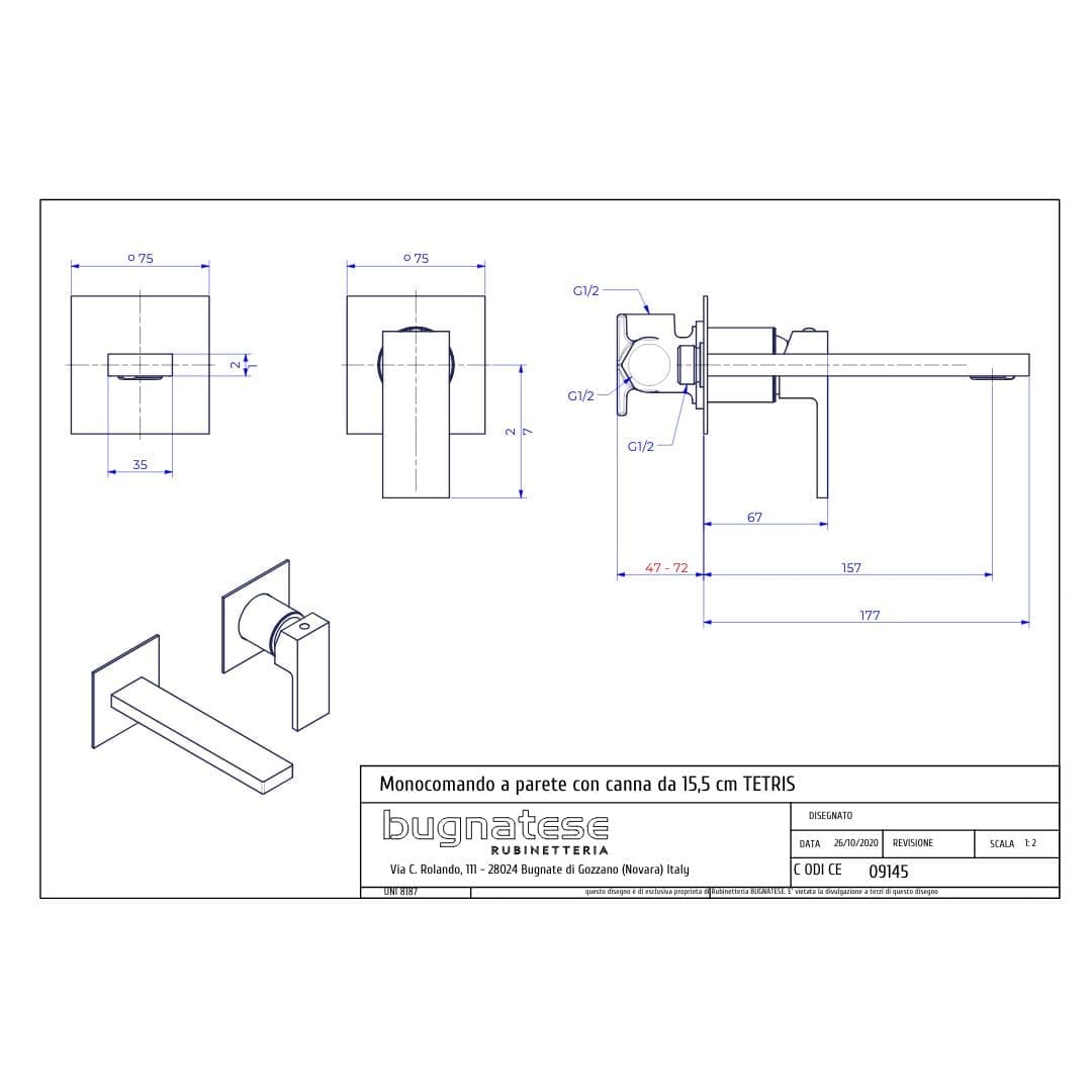 Caratteristiche tecniche: Miscelatore monocomando a parete con piastre separate e canna da 15,5 cm, con cartuccia da 35 mm. Utilizza il corpo da incasso articolo 19891 (compreso). Piletta Clic – Clac inclusa.