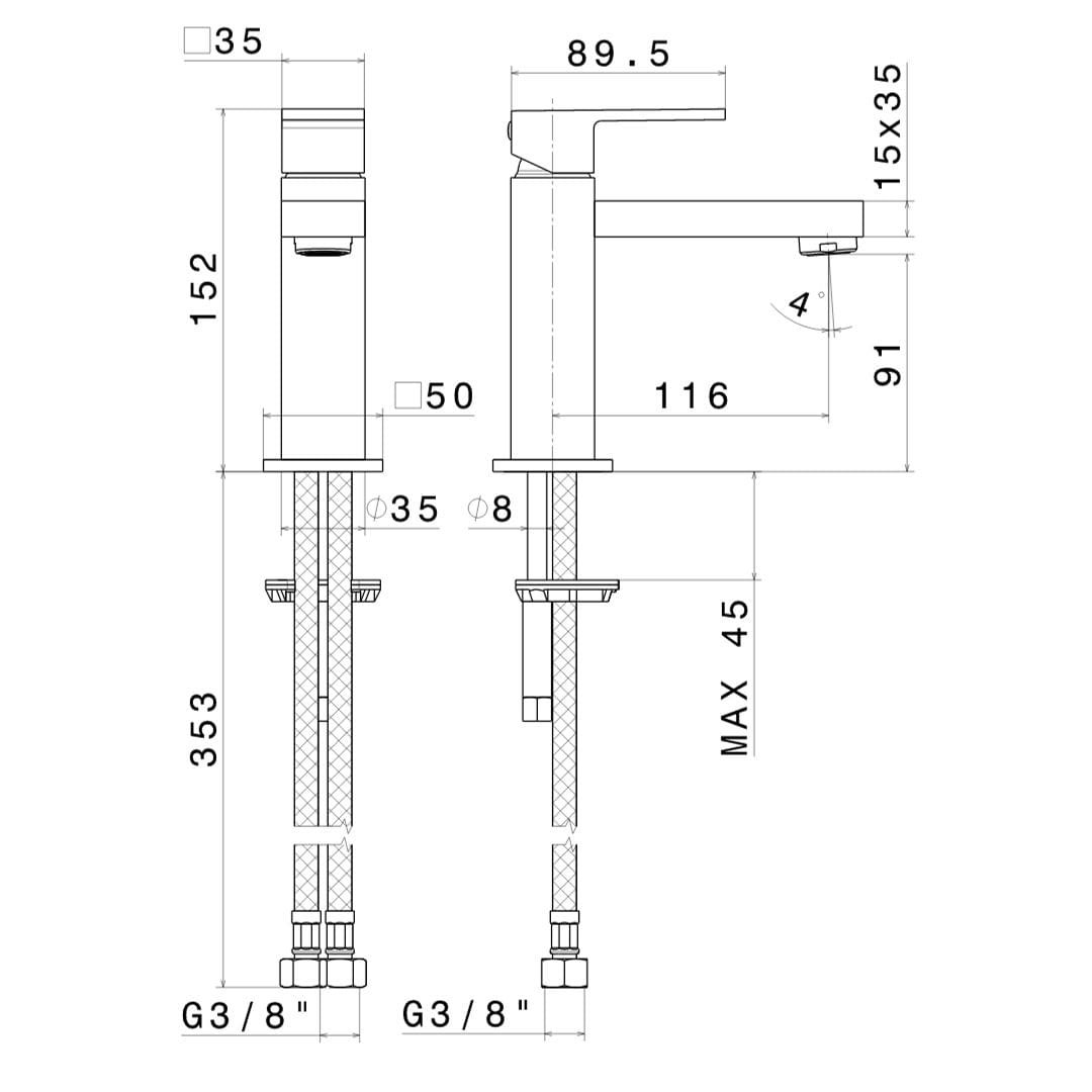 Caratteristiche tecniche: Miscelatore monocomando per lavabo senza scarico. Flessibili di alimentazione F 3/8”.