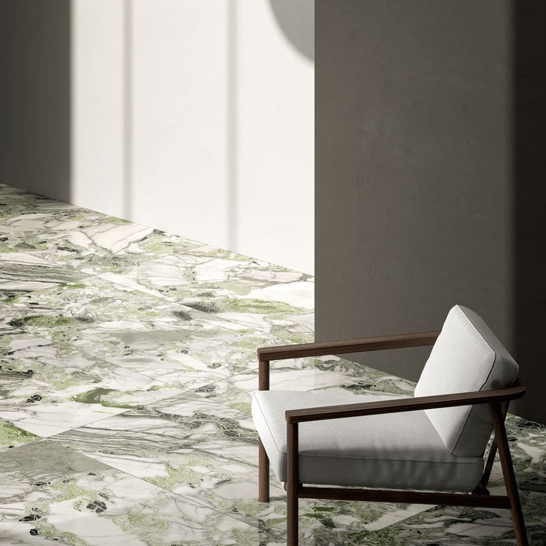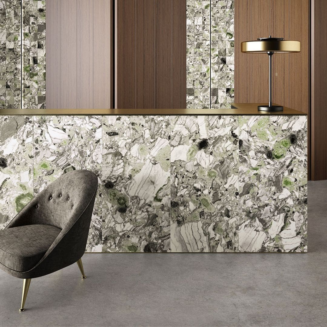 Fioranese ripensa al marmo come ad un elemento da scomporre, frammentare e ricostruire in un gioco di linee e forme, di accostamenti cromatici inediti e originali che muovono pareti e spazio. Oltre ai colori classici, il bianco, il nero, il beige e il rosa, Fioranese propone un verde intenso, per gusti decisi e forti.