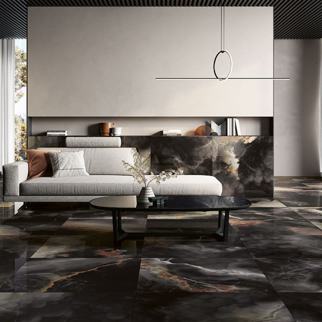 Una interpretazione dell’onice che mette in luce le sue caratteristiche di profondità, lucentezza e preziosità: il risultato è un gres porcellanato effetto pietra elegantissimo, dal carattere deciso e dall’anima UNICA.