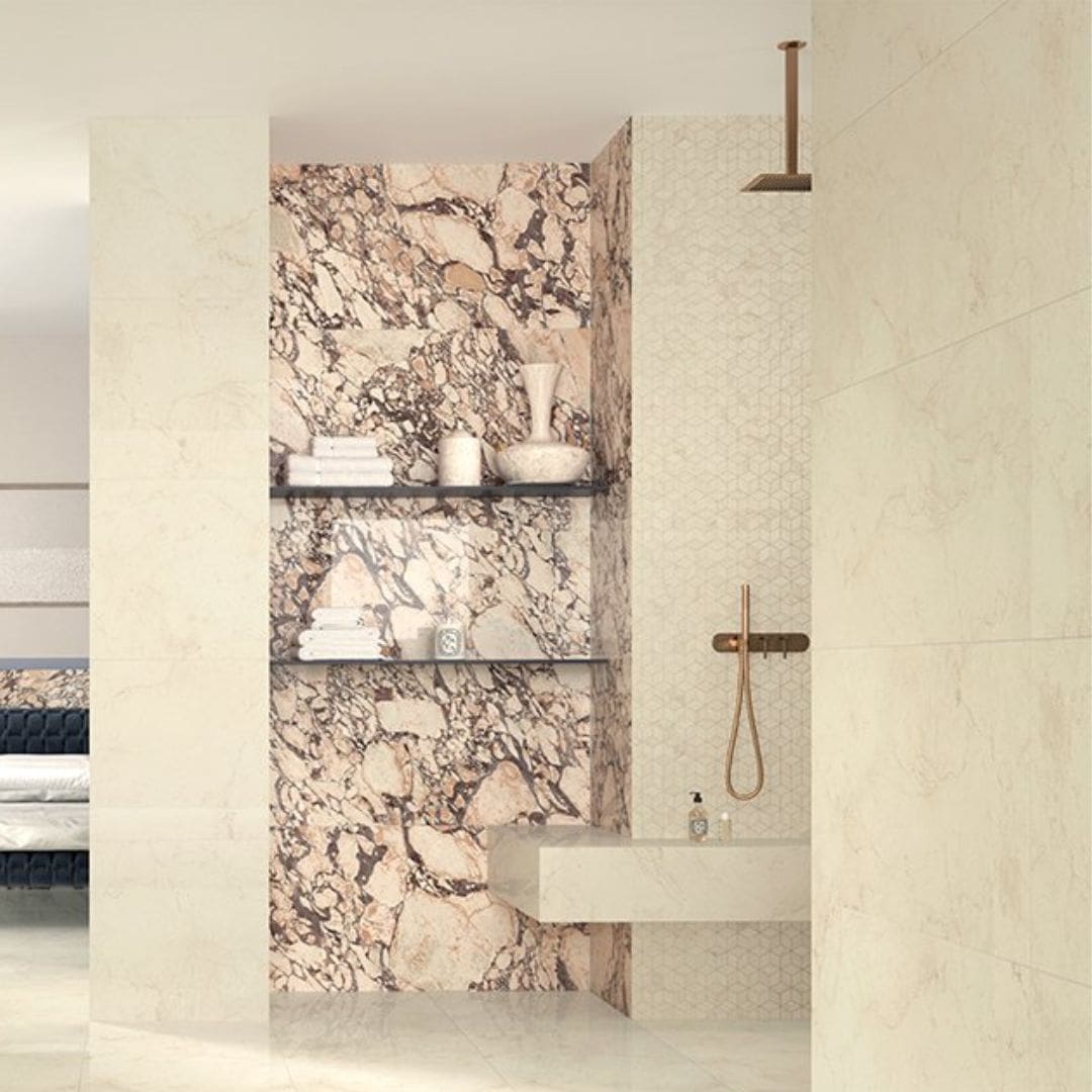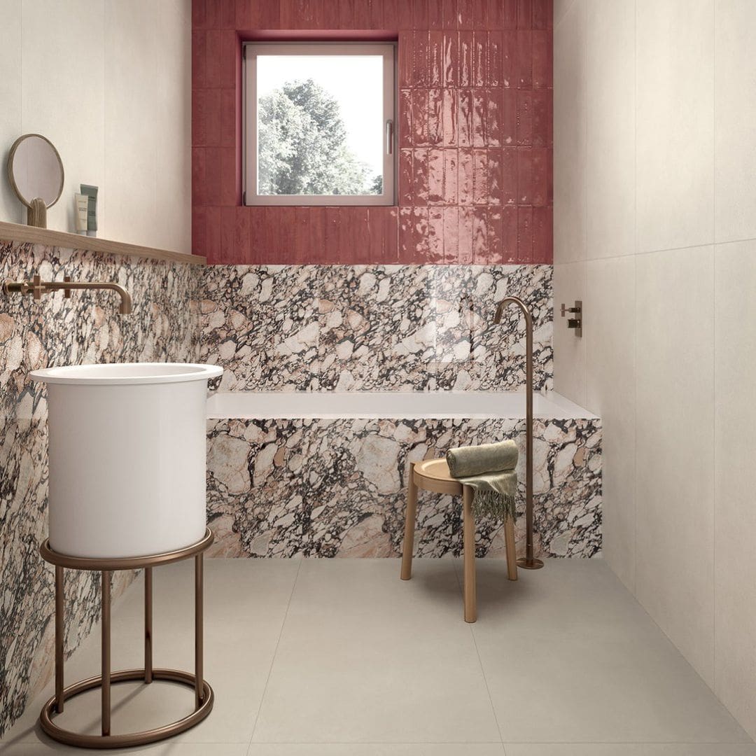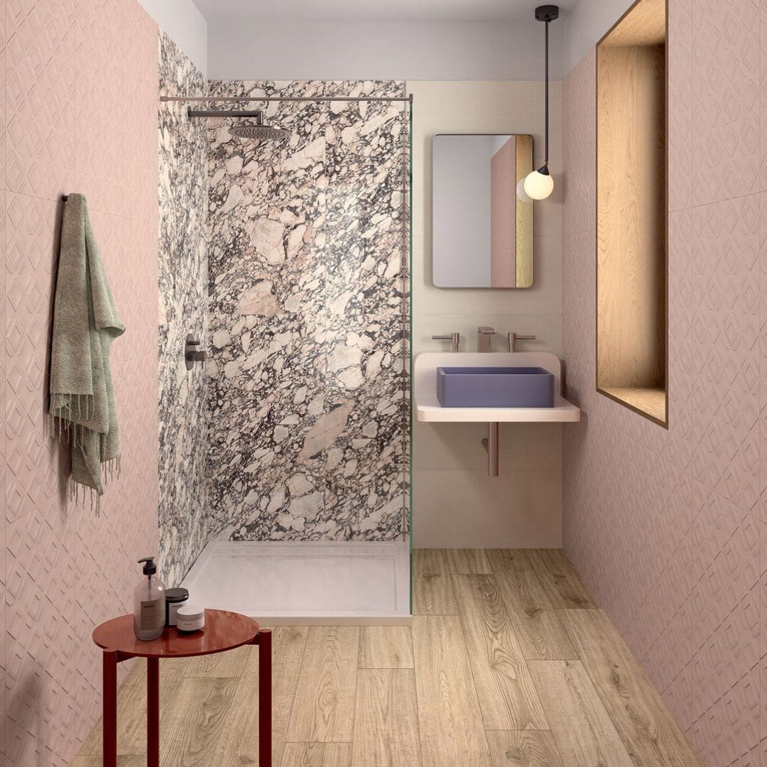 Ai grandi formati si affiancano poi raffinate tessere decorative, quadrate, a rombo e micro, la soluzione ideale per donare carattere a piccole quinte, nicchie, zone lavabo e box doccia.