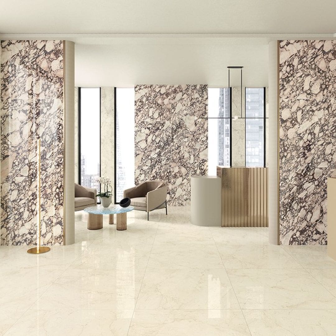 La collezione Foyer Royal reinterpreta il concetto di eleganza senza tempo attraverso una riproduzione fedele ma soprendente dei marmi più pregiati: i nuovi pavimenti e rivestimenti in gres effetto marmo Marca Corona sono studiati per regalare agli interni residenziali e commerciali un carattere esclusivo e scenografico.