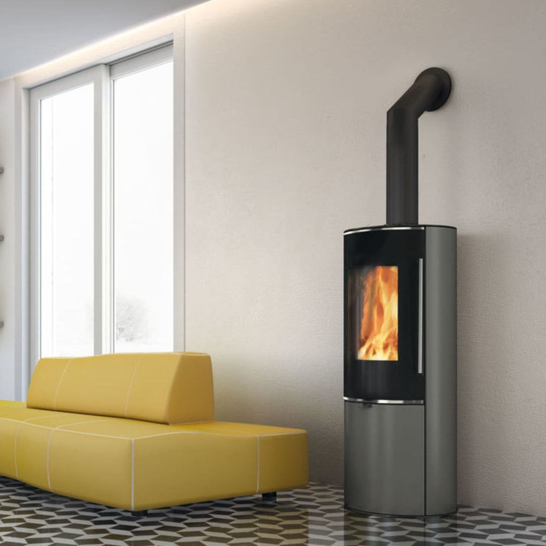 Descrizione: Stufa a legna, con ampio vetro tondo che esalta il naturale andamento della fiamma.