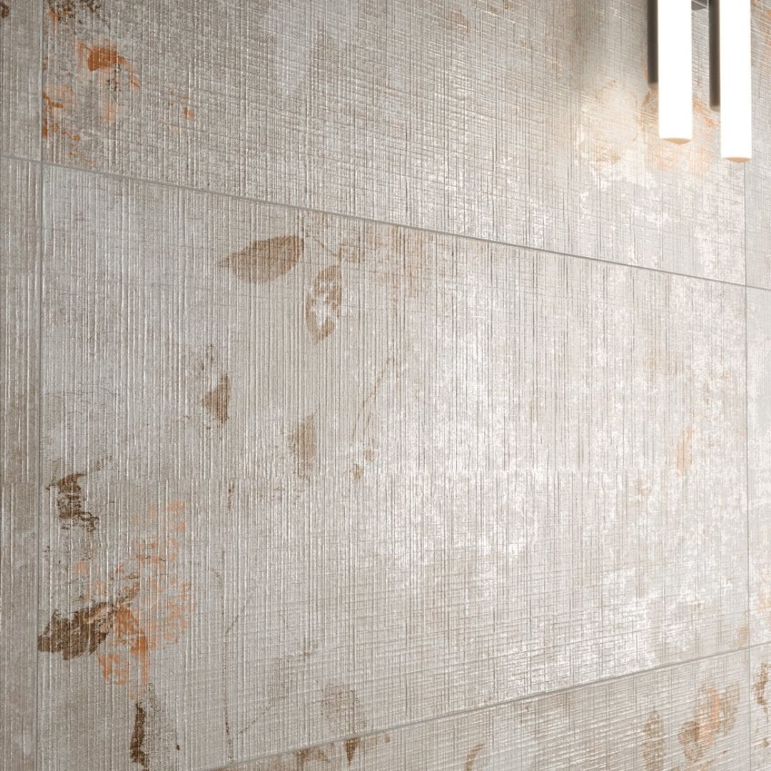 Caratteristiche tecniche: Rivestimento in pasta bianca, prima scelta, rettificato, superficie con struttura a trama in rilievo